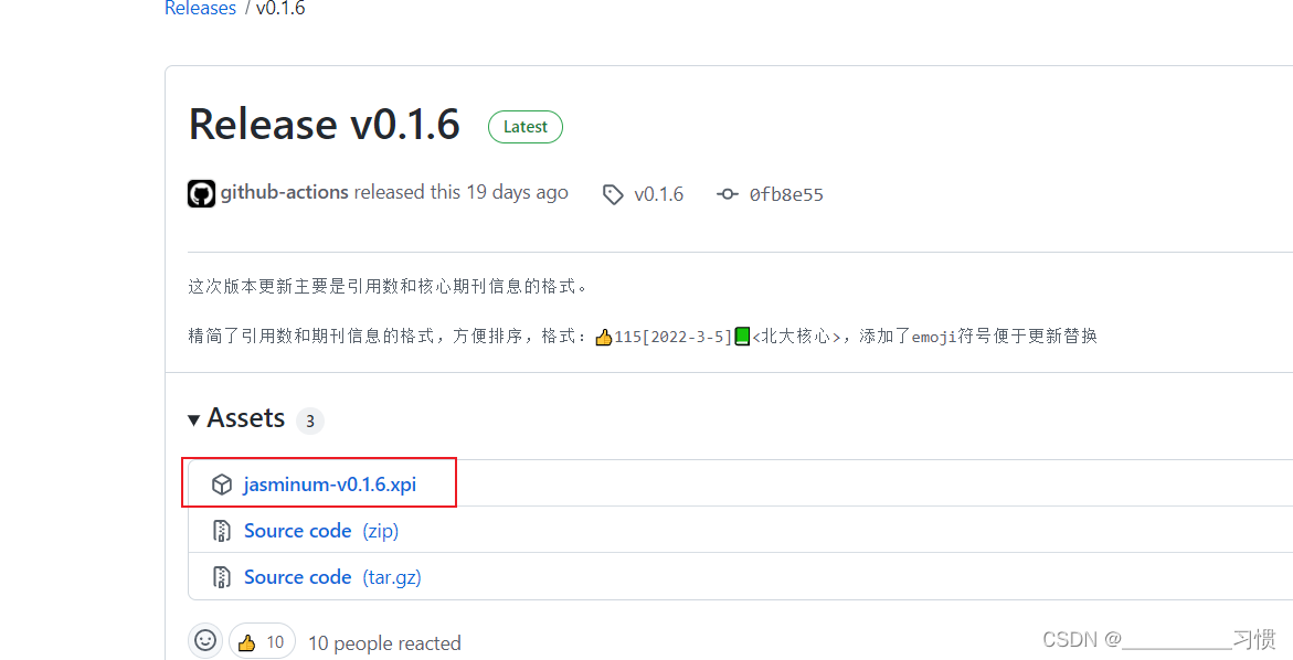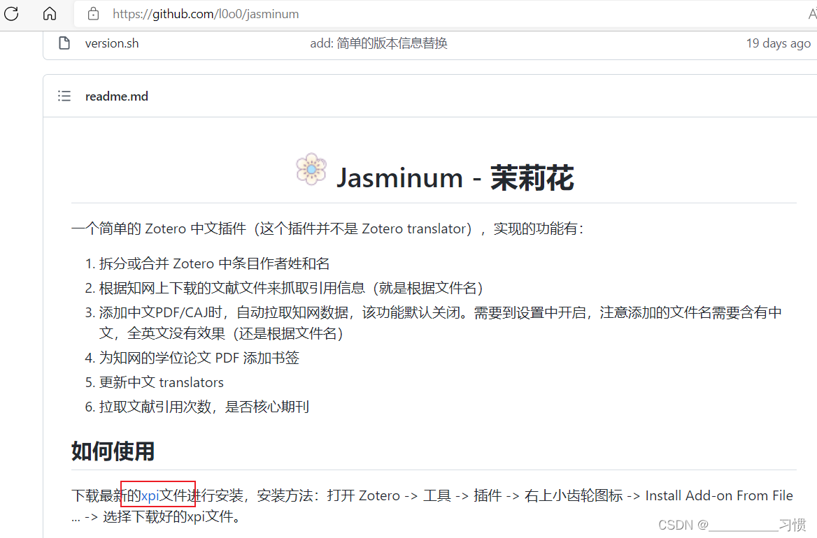 [在 github 页面搜索 Jasminum](https://github.com/l0o0/jasminum),点击 xpi 文件。