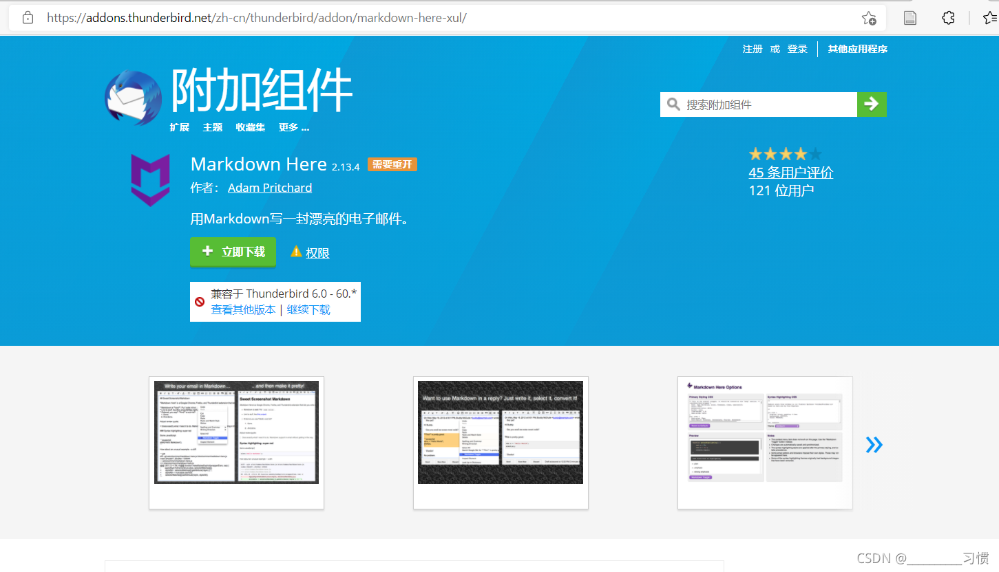首先,在网上下载一个 [MarkDown 插件](https://addons.thunderbird.net/zh-cn/thunderbird/addon/markdown-here-xul/)。