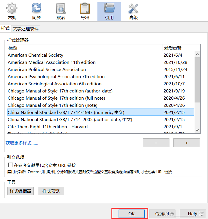 比如写毕业论文,会用到国标格式 (一开始这个里面是没有这种格式的,如何将国标格式添加到这里面,将在 7.4 进行说明),我们就选择一个自己需要的国标格式,然后点击 ok。