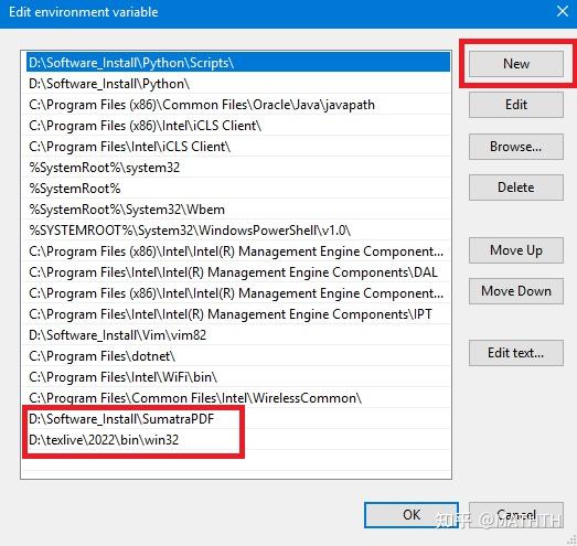 这一步很关键, 如果没有将 texlive, SumatraPDF 的安装路径添加到到环境变量中, 后续编译的时候可能导致计算机找不到对应的工具而出错, 大致的原理相当于生活中给每家每户安装一个门牌号码, 需要的时候按门牌号码去寻找.