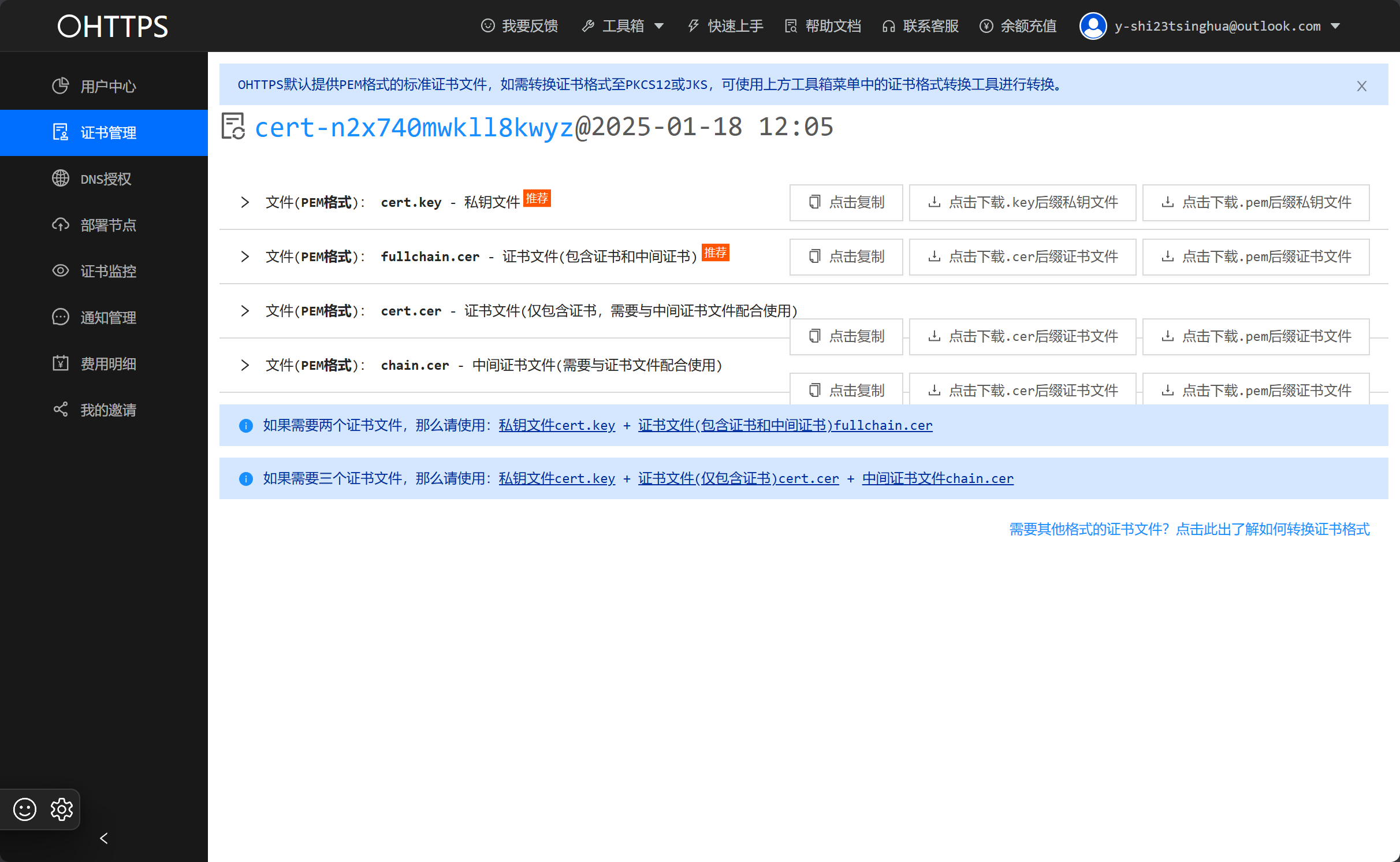 在OHTTPS-免费HTTPS证书(SSL证书)、自动化更新、部署、监控中可以获取免费的ssl证书。下载.key后缀私钥文件和.pem后缀证书文件。