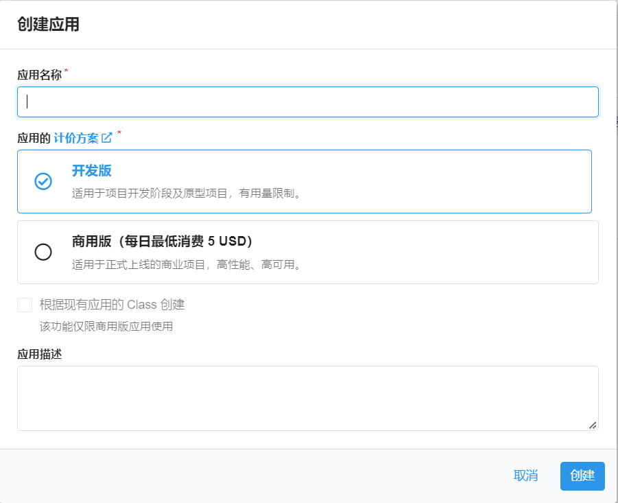 点击左上角 创建应用 并起一个你喜欢的名字 (请选择免费的开发版):