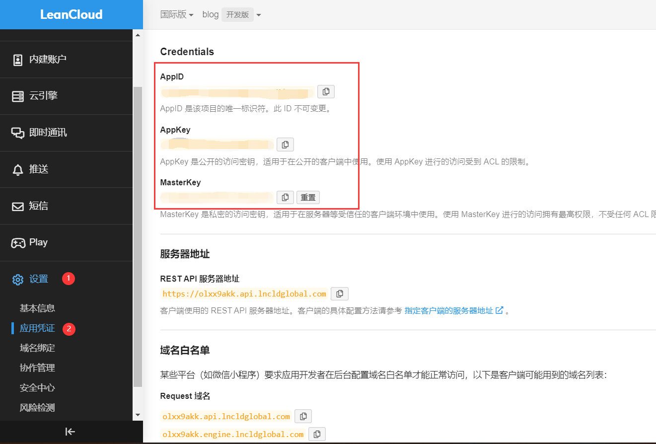 进入应用,选择左下角的 设置 > 应用 Key。你可以看到你的 APP ID,APP Key 和 Master Key。请记录它们,以便后续使用。