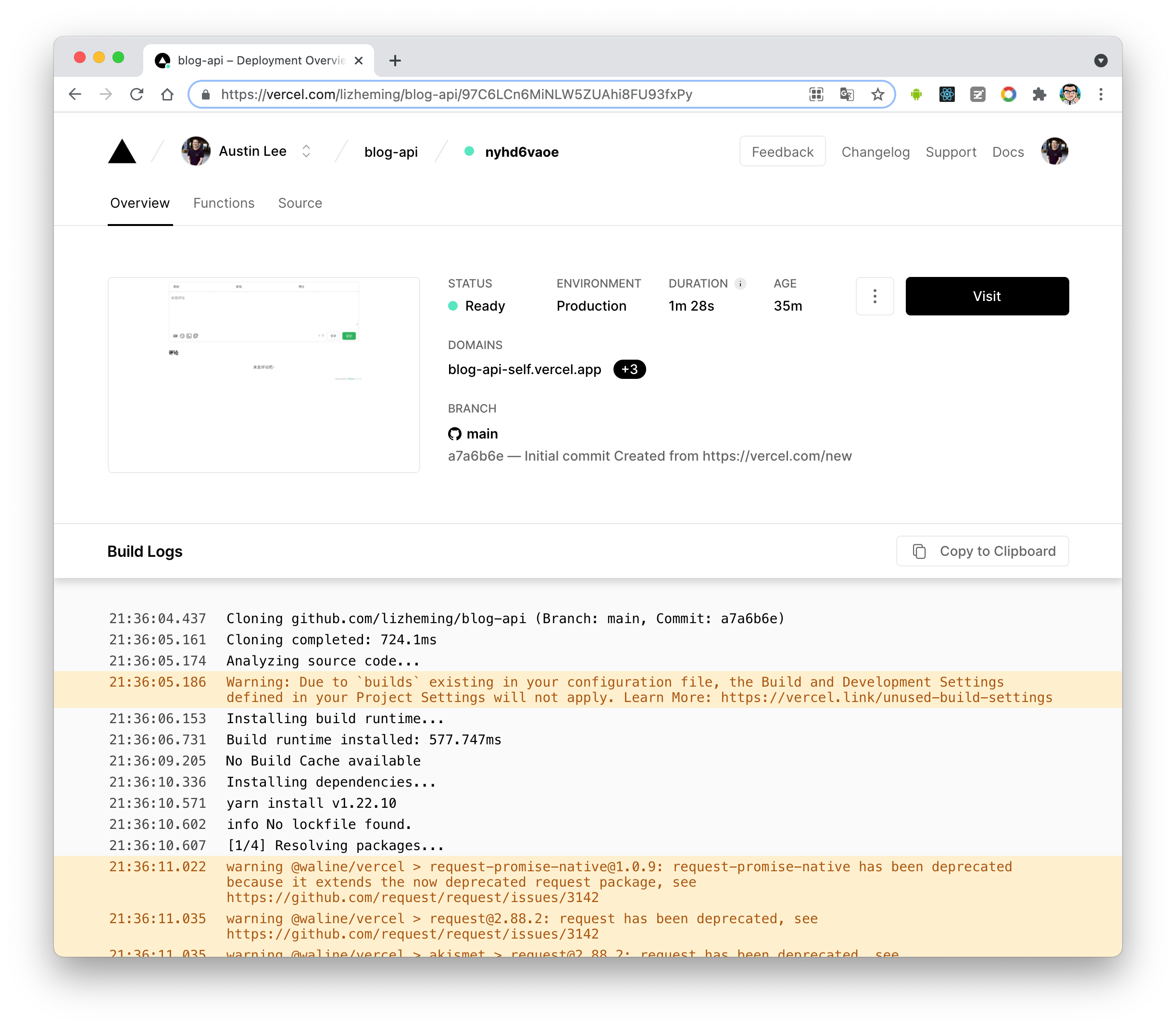 此时会跳转到 Overview 界面开始部署,等待片刻后 STATUS 会变成 Ready。此时请点击 Visit ,即可跳转到部署好的网站地址,此地址即为你的服务端地址。